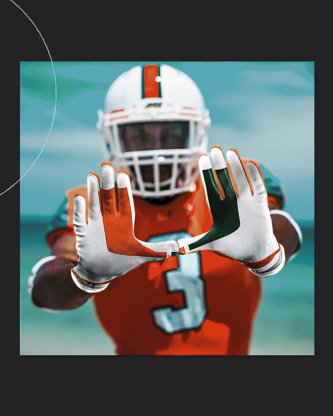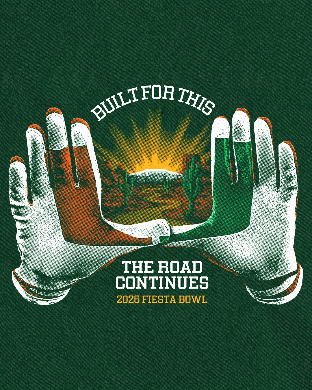 This design features iconic football gloves throwing up the U, with UM orange-and-green Split U printed on the palms. Arizona desert elements, including cacti, sun, terrain and high plateaus, and State Farm Stadium, live within the negative space between the hands, symbolizing the destination and magnitude of the Fiesta Bowl, with the moment itself framed by the U as Miami steps into this surreal moment.