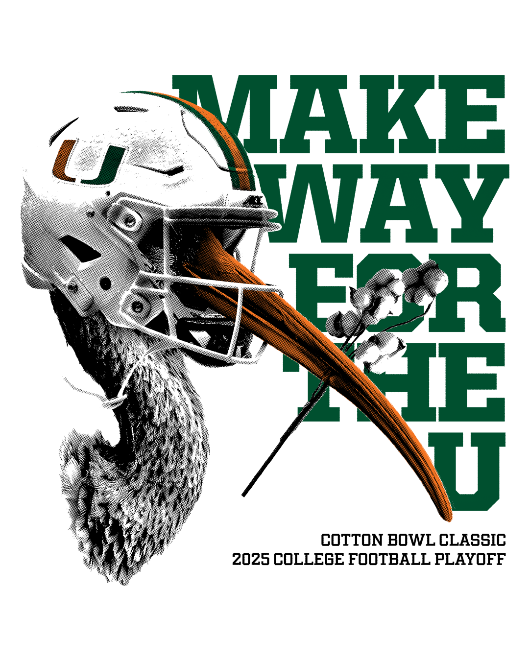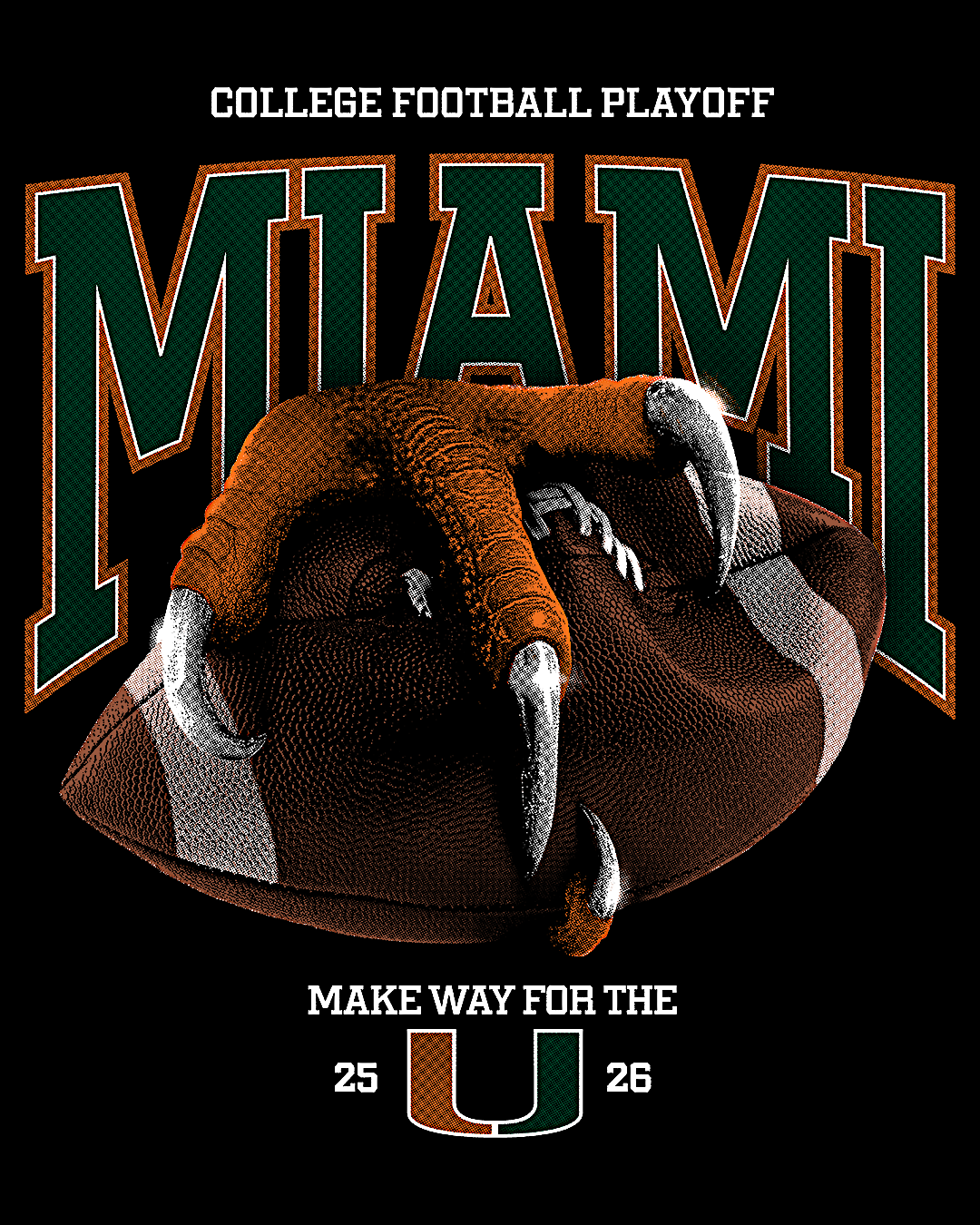 A bold ibis talon in iconic UM orange grips and deflates a football, symbolizing Miami’s power and momentum as the Canes begin their playoff run. The design pairs nostalgic collegiate typography with a modern streetwear edge, featuring “Miami” in green, white, and orange, plus a Split U lockup and “Make Way For The” tagline to ground the piece in UM tradition while signaling this historic moment.