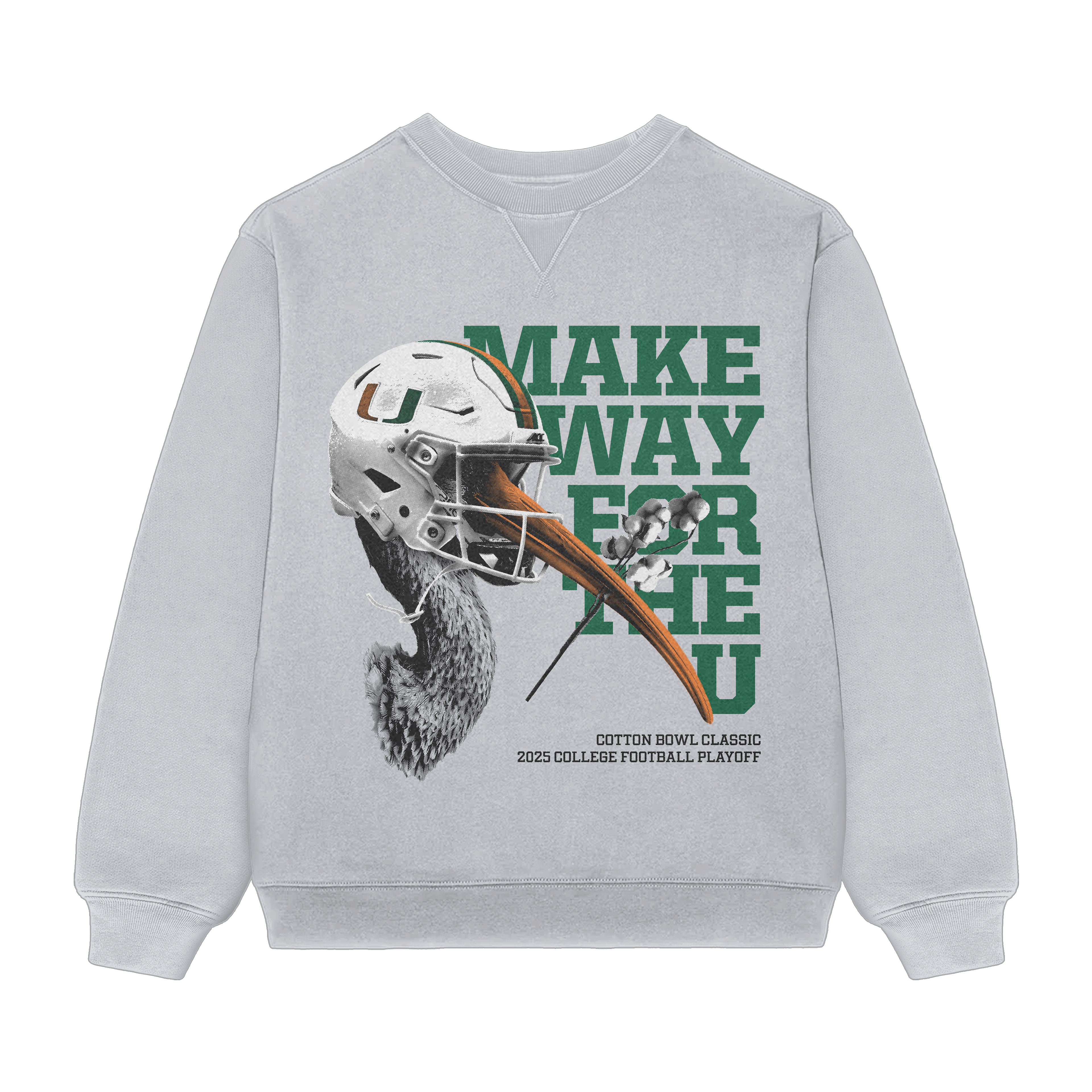 This sweatshirt features an ibis locked in and game-ready, wearing a Miami Hurricanes football helmet and gripping a cotton stalk to symbolize the Cotton Bowl stage. The design is grounded with the “Make Way For The U” playoff mantra, marking the moment while capturing the intensity and focus of Miami’s next playoff battle.