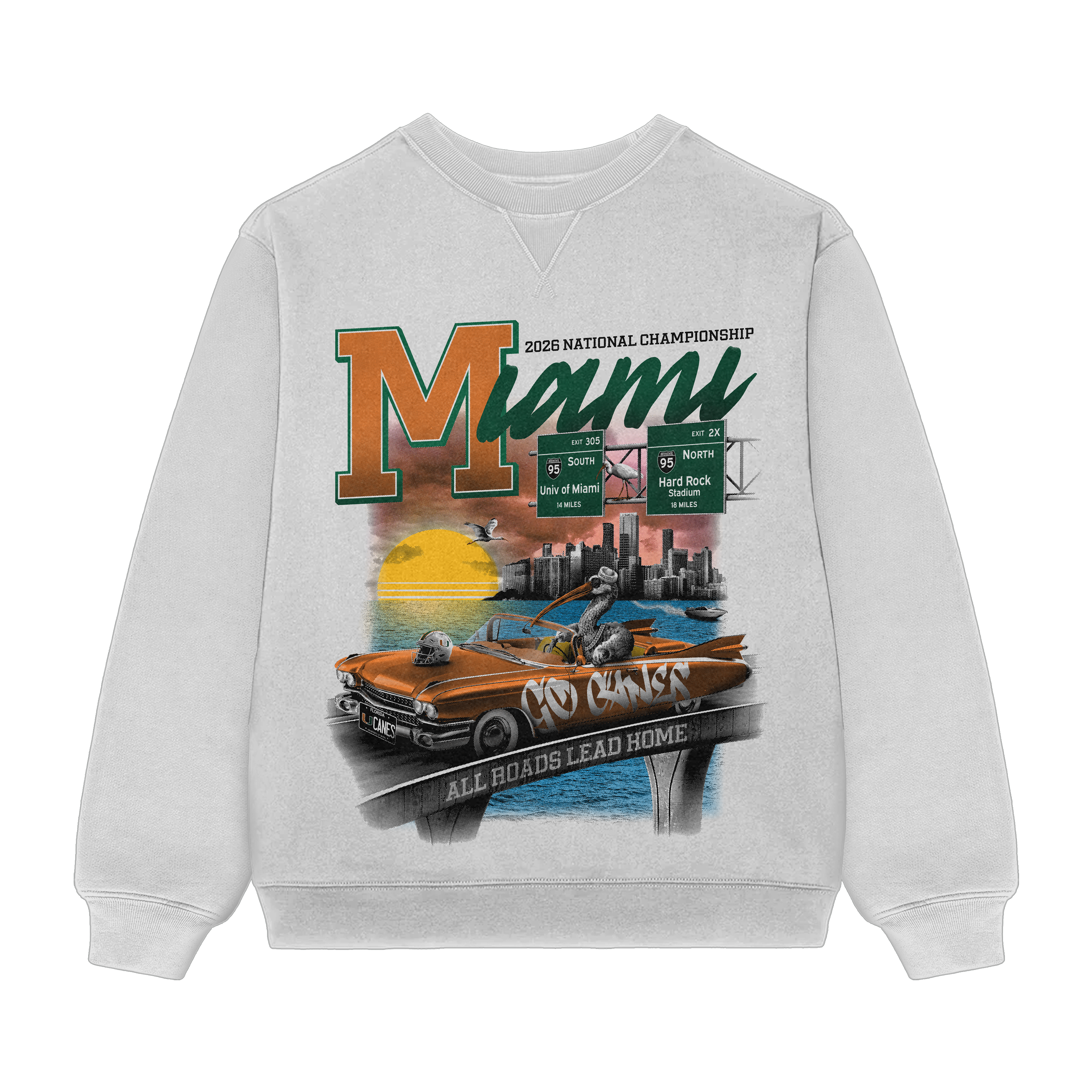 This National Championship design fully centers Miami culture, featuring an ibis inspired by Sebastian cruising in a vintage UM-orange lowrider, complete with a Hurricane helmet hood ornament, Miami vanity license plate, and graffiti details saying "Go Canes" inspired by Wynwood art. Set against iconic Miami highway overpasses, Biscayne Bay, and the city skyline, this design layers local symbolism, vintage typography, and Miami Vice color tones to reinforce the message that the championship stage is a homecoming.